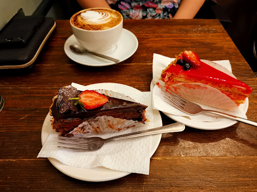 Read moreWe popped into this place as we were seeking cake and the window display looked incredibly enticing. Beyond the colorful range of delicious-looking cakes in the window we were met with an abundance of cookies and other bakes inside. We chose a slice of chocolate cake and a slice of strawberry cake to share. Both were mouthwatering. Soft, flavoursome, and with creamy fillings and a rich glaze. I had a freshly squeezed orange juice (there were a number of juices available) whilst my friend had a coffee.