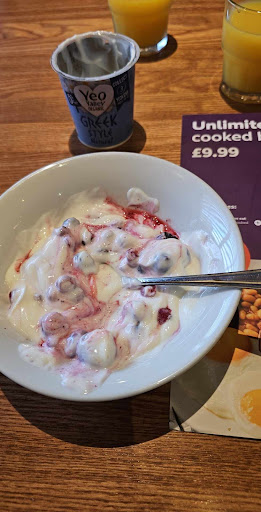Read moreWe had breakfast here Christmas Eve at 10am it's a family tradition to go for a fry up as we have a party later in the day. The bacon was like shiny cardboard it had obviously been sat around in a food warmer for quite some time. You order per rasher and the kids wouldn't eat it. the sausages were absolutely tiny too I would recommend ordering an extra sausage to normal if you do chamce your arm here. There is only one toaster and it takes ages to toast the bread. The food was warm and we asked for poached eggs and they were cooked perfectly however it just wasn't hot as a breakfast. Other notable complaints are halfway through our breakfast we were told that they were packing everything away and told if we wanted more toast or croissants to go get them. We didn't want more but if we did we would have to have left the food we were eating to go and get it. After about 15 minutes of sitting in the restaurant I asked the waitress if she could change the music as Santa Claus is coming to town was now on about its 5th time being played. The waitress said that the music system was broken they have called head office but no one will come and fix it and if we think it's bad for us imagine having to deal with it for a complete shift. Now I completely agree that does sound a lot worse but if a customer complains they should do everyone a favour and turn it off. It slowly became torture throughout breakfast and I felt like I was stuck in a perpetual loop of madness descending into a hell that could be likened to that which the inmates of Guatanomo Bay are able to relate to. I honestly can't believe that they refused to turn off the music and subjected us as customers to 45 minutes of Santa Claus is coming to town I'm thankful to be honest that it was stuck on that and not Steeleye spans' Gaudette as I may have lost the will to live had that have happened. Small...