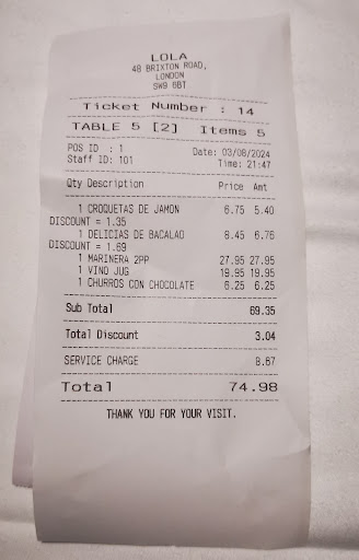 We came here through the fork and came specifically to eat good Spanish food. The food was not good and overpriced. After a few minutes the place was empty and we felt like unwelcomed guests. At 10:30 p.m. we were told that the kitchen would close soon and that the restaurant would close at 11 p.m. We had seen that the closing time on Saturday was midnight and the girl replied, "Oh that's right, today is Saturday! But the kitchen will close at 11 anyway." After 10 minutes two more people come in and ask if it was possible to eat and the same waitress told them "Sure!" In addition to being teased as they evidently wanted to close earlier than expected, we are given the bill without a 20% discount the fork. After mentioning the discount we are told that it would only apply to tapas. In the end we only received £3 discount as according to the caterer it is not applied to paella. The conditions were "excluding set menus and drinks" and I have been booking with the fork for 10 years all over the world. This is the first time I have ever been told a lie. I was not even supposed to pay for the nonexistent service/tips amounting to 12.5% of the total.