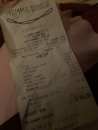 Read moreWaited an hour for tap water after 3 times asking. Food arrived 75 minutes after we arrived. I’d booked a table for 3 for early pre theatre food. There was just not enough staff. My vegan country bumpkin was dry with an inadequate amount of sauce and burnt kale. My guests didn’t know if their pizzas were good as they were so Hungary after a 2 hour journey. I had come as I had had a delicious meal before here with brilliant service and friendly atmosphere. So disappointed. We had to leave promptly to get to our event and on reflection we should have not paid for the food. We bumped into a disgruntled mum and daughter who walked out as they said their pizzas were terrible and couldn’t eat them. £83 that cost me so feel ripped off and disappointed.UPDATE. Received an email from head office saying the Norwood branch would be in touch. Still waiting for some explanation / apology/ discussion … nothing. When I see my co diners we still feel embarrassed and ripped off. Such a shame. Was planning a large big birthday and this would have been a...