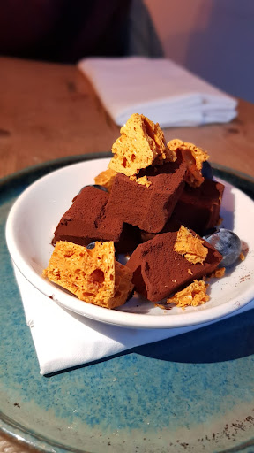 Having enjoyed the rhubarb bellini earlier we opted for the Rhubarb creme brulee (£6.50). We also tried the Bitter chocolate and blossom honey truffles (£6). The creme brulee was incredibly satisying to crack through and had a perfectly caramelised top layer, creamy filling and a fruity addition of rhubarb at the bottom which made for a lovely twist. The truffles were also a real hit with dark and intense flavours. Served with fantastically crunchy honeycomb and blueberries, it cut the richness of the chocolate perfectly.