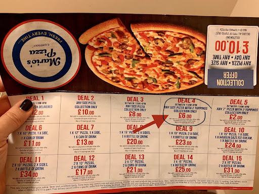 Read moreMe and my boyfriend went several times to Mario's pizza and we always paid full prize pizza. Yesterday we decided to take advantage of one of the offers displayed on the flyer (any size pizza collected between 11am-4pm with 2 topping at £6) and guess what, the owner refused to let us choose that offer stating that it was too cheap, even if we were there at 3ish pm. The owner was eating an apple while he was talking to my boyfriend and told him with arrogance "you can have the offer for £8 because I will not do the one for £6 as is too cheap". We haven't asked for any reduction of the price, we simply wanted the offer from you advertised on your flyer. If you are not willing to sell what you advertise you should remove the offer. Obviously we will never return to Mario's pizza again or send our airbnb guests to Mario's pizza anymore.