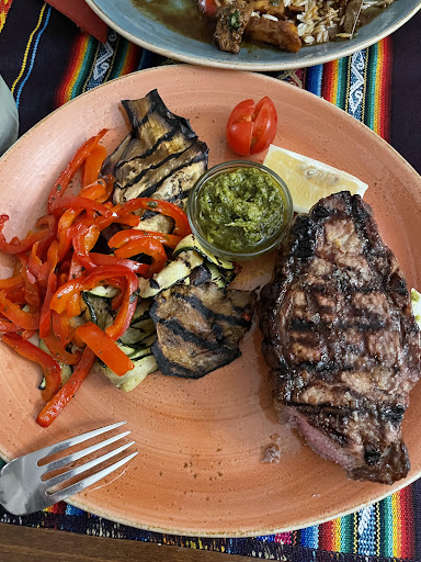 Aside from the usual pizzas and tapas options there were some Argentine and other south American dishes. I chose an Argentine starter (chorizo) and main course (patarashka - sea bream steamed wrapped in banana leaf - see photo.) My wife had chicken in mushroom sauce. All very well prepared and enjoyed.