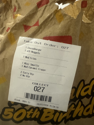 Eventually the food arrived carried by a very harried looking lady. Not her fault. The food was everything you expect from McDonald's, nothing new there.