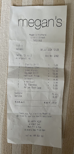 Ā Ā Ā Read moreA crushing disappointment for a highly anticipated culinary experience. Walked in today 24th April, no reservation required with a dear friend for a lovely hearty brunch and catch up in a pretty setting. chose this place as we are former Richmond residents and wanted to catch up locally. Expected a higher calibre of service and food. Was very unimpressed with the server Kevin. when I made my order of mere pancakes with extra fried eggs, I stipulated twice that the " Egg should be well done with no runny yolks at all" He asked if I would like hash browns on the side, I said "why not" as I was in a devil may care mood... and didn't mind the upsell of hashbrowns. Though I was disappointed when the food came (to be fair quite promptly)to see that my eggs came not well done with runny yolks, specifically what I had asked not to happen, I didn't want to be rude and send the food back so i ate it and pushed the yolke to the side, not the end of the world though annoying to not have been listened to. . The waiter Kevin returned and asked how the food was, I mentioned that the eggs were runny and he just shrugged, I said that i had asked for them not to be, and instead of apologising for the error he quite rudely and frankly said and i quote " well i was distracted by how much food you were orderining I was just like!.... go girl" a rude and uncalled for comment. Deriding me for ordering a side of fried eggs with my main!? insinuating that I was some kind of gluttonous swine, when I had only asked for Fried eggs on the side and it was his idea to upsell the hashbrowns. Not professional completely inappropriate, frankly I couldn't believe the gall. A simple acknowledgment or apology for the misgivings would have sufficed rather than being chastised for my appetite as a paying customer. Additionally he gave us our bill and there was a cappuccino on there that we did not order . I pointed it out and once again instead of acknowledging the mistake or apologising he simply said " I'll take that off" and blamed the table before us.... very poor representative of Megans and soured our experience. I will be telling the story of the sassy, acerbic and rude waiter at megans Richmond for some time and advising people to give it a wide berth. Food was average, tiny shavings of pistachio on the pistachio pancakes and , long bananas not chopped up, bacon over done. Would have been better off going to Bill's a short walk away and half...
