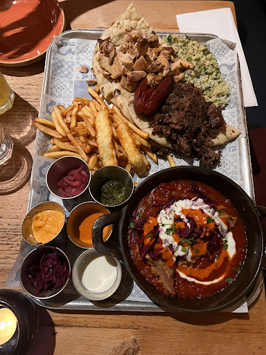 First ever visit for dine in (usually takeaway hot drinks or cake in parsons green or Richmond when working). We got asked many times to order drinks when we arrived but we both waited to wash our hands first and there are only two toilets (one is forever locked it seems). I ordered hot water which was barely lukewarm until I ordered again when it came hot. Also got the mint and passion drink which was so diluted in water and ice that we could barely taste it (maybe thatās how it is?) Issue was mainly with the Meganās feast sharing platter we got. The waitress didnāt go over whatās what on the plate and didnāt have the answers when we asked. Poppy came across a bit on the edge as the place was fairly busy when our food came. The food was room temperature except the shakshuka which was in hot tomato sauce - that was the ONLY warm thing in our main. We didnāt even finish 5% of the lamb. We added the chicken pieces inside shakshuka to have it with warm sauce otherwise there was no other way to have it. Halloumi was non existent pretty much - two tiniest slices in the platter which is Ā£21pp. Fries were so cold I thought they were from early morning being served for dinner. Luckily for us, the kind manager allowed us to swap with sweet potato fries which they forgot about so when they did arrive, they were nice and hot. Honestly the highlight of the meal was the sweet potato fries even though the portion was small (I think there was an error because Poppy did come out with normal portion later but we already ate some of the other ones her colleague gave us).