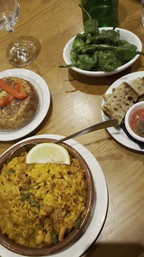 Padron peppers- okay, nothing to write home about Iberica ham- so so, quite tough and rigid Tortilla- VERY dry. Hard to get through Calamari- batter was like cheap chip shop batter rather than crispy squid Croquettes- again okay Paella- felt like it had been made and put into the dish a while ago and just heated up, as it had formed to the shape of the dish and again was quite dry.