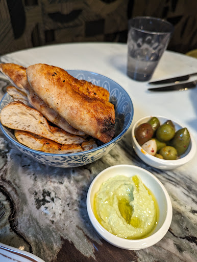 The food was pretty good. The grilled lamb loin with 'healthy vegetables' wasn't quite as virtuous as it appeared, as the vegatables were ungenerous and there was a significant volume of unadvertised creamy sauce. It was well cooked, though, and the meat was decent enough. The chicken has unadvertised vegetables stuffed inside and was overcooked. The chips were disappointing - pale from undercooking, and underseasoned. The ultimate mezze was quite strange, in particular the cheese selection, which amongst others included two fruity English cheeses and what appeared to be marmite cheddar. They were incongruous with the rest of the mezze. The cured meat was not very nice, nor were the dolmades. All in all, despite the fancy plating and with the exception of the dips and bread, the mezze felt like an assembly of mediocre-quality supermarket ingredients.