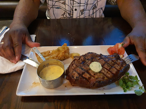 Our server came fairly quickly to see to our drinks order and another server came and took our meal order. There is a quite extensive menu including burgers, and I liked how there were suggestions on how best to have your steak. But of course you can have it anyway you want. My son had the Canadian 16oz steak, rare - he said it wasn't as good as he had hoped. He also had ribs on the side - no comment there, the bones were cleaned, so you decide. He also had a side order of the Lobster tail, undecided as we all thought they were a little over done and dry. Hard to extricate from the shell (we all had lobster tail, mine came with the steak). My steak melted (medium well) in my mouth, it was delicious with the bernaise sauce. The onion loaf was lovely. Just the right amount. I also had prawns and scallops in garlic and herb butter.... deeelicious! Triple cooked fries just right, greens to share - just the right amount of crunch. My husband had his 16oz steak well done - clean plate! But he didn't like his peppercorn sauce. We did have to wait a little while longer than I would have expected between the "wedge" arriving (a half of lettuce with your choice of dressing) and our main course which was also missing one of the sides! Overall...this was indeed waaay better than a chicken and chips takeaway. My compliments to the chef. Why didn't I give 5 stars? There was no disabled /wheelchair access that I could see at the front. And I think the wedge of tomato that came with the steak should have been grilled as well as the lemon. I wish I'd had time for a dessert because they looked great...maybe next timeđ Also I forgot to take some food snaps, that's what a good steak does to you.