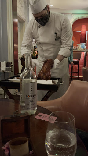Understandably, being new there are a couple of points worth mentioning for feedback purposes only, as my overall experience was very positive and I plan on returning. We ordered a lovely bottle of wine, the waiter asked how many people will be drinking wine to which my brother clearly replied, he would only taste it and my father and I would be drinking it, so 3 glasses were required. Only two glasses were provided, one to my brother and one to my father. After tasting, my brother clarified again that he will not be drinking the wine and that I would be, but the waiter was simply going to refill my brother's glass and give that to me; we had to ask, again, for another glass for me. I was surprised at the portion size of the Peking Duck served, it was delicious but considering only one course of this is offered here, and the price, I do not think it was worth it. We asked what happens to the remainder of the duck and the waitress said 'it goes in the bin'. I have eaten Peking Duck at Kai, Min Jiang, Novikov Asian and Hakkasan and comparatively, the portion here is relatively small especially for 4 people. I just about managed to enjoy two pancakes.