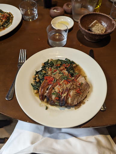 Our mains came out 45 minutes into our allotted one hour dining time as a walk in. The wood fired pork was served in three slices cut so thin youâd think youâre in a deli. The hake dishâs most flavorful element was romaine lettuce. No amount of salt or stale pre-ground pepper (on every table) could pull an ounce of flavor from either dish. This was nursing home food, and the ambience was there to match. No music, too bright lights, staff standing around looking more worried we might pass away rather than if weâre having a good time.