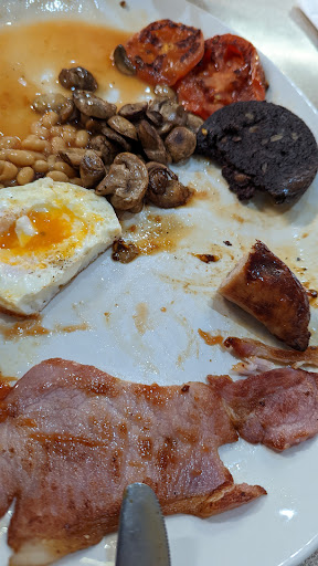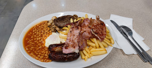 I got the first breakfast on the menu and it was lush. Sausage is tasty, not too spicy, but full of meat. Thick bacon, good quality eggs and mushrooms, non generic brand beans, which are all very tasty. As you can see in the picture, I was halfway through and still so much more to go 😄 All the sauces are genuine of what it says on the bottle. Order before you sit down and you'll find the friendliest staff offering and catering to what you desire. The gargantuan plates just about have enough space for all the food that's ordered. Be aware tea and coffee are extra, but I feel that just asked you more freedom to choose whatever. I know after a night out I need at least 3 drinks in front of me the next day 🤣🤣🤣 I think I've defo found my cafe in the area and will return as I saw a mountain of mash, peas and sausages being delivered to a table which...
