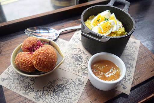For starters, I opted to try all the starters on the menu, so I could taste all the dishes they had to offer. For the first starter, Foggâs flaked smoked haddock kedgeree was presented, I have never had kedgeree before, and so this was a new dish for me to try. The Mr Foggâs version consisted of chunks of Haddock, wrapped in curried boiled rice with the boiled egg lying on the top.