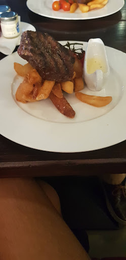 We got our “mocktail” im sorry but that was No mocktail it just tasted like cheap carton juices put together. We then had our main come along we were excited to try the steak, we both asked for medium well done, but my husband steak was full of blood & full of fatty jelly like bits in his steak. He was struggling taking fatty bits out of his mouth i asked him to ask to get it changed he was hesitant in doing so due to anxiety, he then had the courage to ask for it to be changed, when the change of food arrived it looked like they just re cooked his one again & gave it back to him as it looked like it was chopped smaller & was full of fatty jelly bits again. Mine was so hard to chew and to cut into was hard, I have tried all types of steak and all types of cut of steak but this was really terrible. I did not want to cause commotion or scene so i said nothing but gave my bit to my husband to try as his one was worse than mine he also said it was too hard to cut into & too chewy so he didn’t finish it. The chips were decent, sadly they were cold too. The mushroom sauce was triggering my asthma because they added way too much pepper into it even my husband was coughing from it.