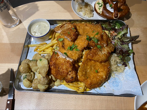 Read moreI've visited the Canary Wharf branch a few times (mostly for the beer garden as inside doesn't offer much in the way of atmosphere) and enjoyed it, so was looking forward to this visit as part of a quiz night. Staff upstairs were very helpful in directing us down to the place where the quiz was taking place (in the basement). There was plenty of space, with each table seating around 10 people. We were greeted at the table within moments of arriving by an staff member who was very enthusiastic but hadn't given us time to look at the menu (one per table) yet, so we had to ask them to come back a little later. As a vegetarian, food choices are limited. We opted for the vegan platter for two and it was so disappointing, especially at a cost of £33. The sausages were dry and hard and I'm not sure what the vegan schnitzel was, but it was nothing like any schnitzel I've ever had. There are great vegan/veggie products out there that mimic the sort of meat options this establishment serves, so I'm not sure why they've chosen such terrible components for their menu. The pretzel bun ended up being the nicest part of the meal. Our friends' (meat) schnitzel platter looked good and was apparently very tasty. I would say the platters for 2 would easily feed 3-4: both the vegan and the meat ones. We found that once our food was served (the vegan platter ariving 5-10 minutes after our friends' meat one), we weren't checked on or even able to flag down a member of staff. I appreciate that it was very busy at this time, but please remember to come check on tables. I wanted an additional condiment and eventually had to go and chase someone down to get it. Thankfully service picked up again a bit later so we were able to order drinks throughout the quiz. In the ladies' toilets, at least one of the three cubicles didn't have a functioning lock. Another customer told me she'd had problems with two of the three, but I can't verify this. Finally, the bench seating, though very practical, doesn't offer much comfort. The team on the next table to us - who you share a bench with - were moving about a lot, meaning we were constantly being jostled in our seats. Probably not something you notice after a few steins, but definitely uncomfortable...