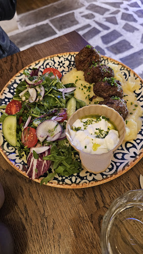 We ordered the meze starters, including hummus, gigantes, dolmadakia, and warm pita bread. The food was absolutely delicious! When the dolmadakia came topped with garlic yogurt (which my partner and I couldn’t eat as we’re vegan), the waitress was incredibly accommodating. She quickly replaced it with a version without the yogurt, which we really appreciated.