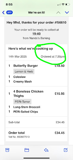 I met my two friends here. First time visiting the Barking branch (parked in Vicarage Fields). We ordered at the till (I mention this for a reason). I ordered the chicken butterfly with garlic bread and salad which arrived at my table a few minutes later. My chicken must have been on a serious diet before it got served up on a plate as the chicken breast had shrunk considerably in size (probably about the size of the palm of my hand and I don't have big hands!). Chicken breast was very dry so had to smother it with Nandos sauce to help it go down my throat and garlic bread was chewy and hard on the edges but at least I enjoyed the company! 🤣