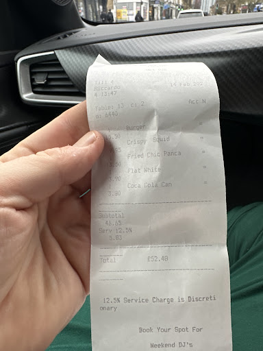 We waited almost 20 minutes with no one asking how was everything? No one cleared the plates. In fact there was absolutely no one. So I had to go and find someone which is not ideal missing a leg. But no matter how many limbs you have shouldn't mean you have to go on an expedition to find someone. This member of staff could not have cared less. Mumbled sorry for no one coming over and gave me a bill with 12.5% SERVICE! He even gave me the card machine the wrong way round so I could add a tip.