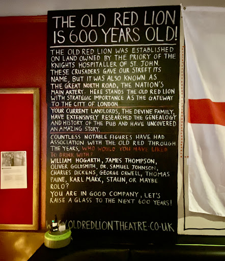 The Old Red Lion Theatre Pub, a 600-year-old gem in the heart of Angel, provided a cozy and intimate setting for the play. The pub itself, while showing its age in places, exudes charm and warmth. The outside area is an ok spot to enjoy a drink before the show, and the theatre upstairs offers a comfortable and engaging space for performances.