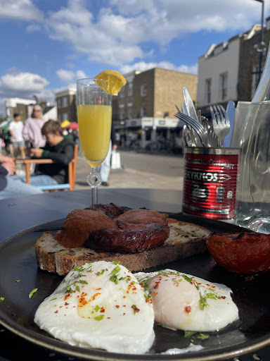 One of the staff greeted me right away with a friendly smile and made sure I was all set. I ordered a mimosa and their Spanish sausages with poached eggs, and just relaxed in the sun while waiting for my food. (I did sneak a look inside, and it’s super cool—lots of plants and a really fresh vibe.)