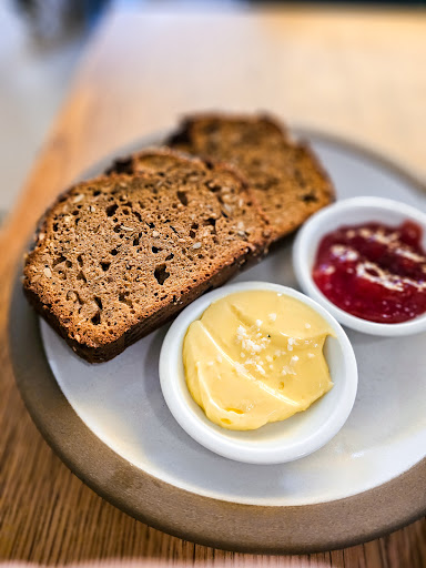 I ordered a cappuccino and banana bread. The coffee itself looked nice, but the foam was quite thin and overall seemed a bit watery. The flavour was good though. The banana bread was sort of disappointing though. You get a huge slice, but it's... not very banana-y. It was very dense and quite dry. Maybe that's banana bread here, but in the States (where it was invented and is everywhere), banana bread should be moist and fluffy and really taste (and see) the banana. It also shouldn't be the colour of fruitcake. The crust of the bread was really good though. The butter and jam was strange. I like a nice smoked, salted butter but it really did not mesh with the sweet bread. I get they're trying to be fancy and make the hefty £8 price tag seem worth it. It was just weird though. A nice clotted or thick double cream instead of butter would have been much better, especially with that type of banana bread.