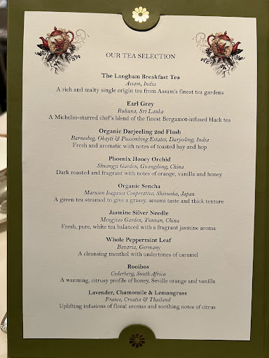 We were asked for our drink choices, and we ordered still water to start. It took 15 minutes for the water to arrive. Then it took more time before the server took our order. We all ordered the afternoon tea and the Langham blend tea. We werenât served tea until after our first round of sandwiches. Our table was not cleared in a timely manner between courses and tea changes this was particularly problematic as the table was very small for four settings.