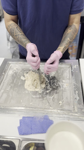 The Pan-n-Ice where we found the rolling ice cream this is different to comparing with other ice creams. We have multiple options to select the flavour and other things , so we ordered the ice cream named The G.O.A.T which comes with ferrero rocher, kinder Bueno, Nutella and Oreo. Once we ordered we stay in the line and wait for our turn. One we reach the counter they start to take all the cookies, chocolates, and cream that we selected and start breaking them on a ice platform which looks soo different and kind of messy, once all the stuff got in to pieces they make them roll and place in a bowl and topping them with selected flavour of cream. The taste was good and the was excellent definitely worth of waiting and recommending to all the people to try at least once. But I will give 3stars for the service because the people who are working there was not helpful and not having a smiling face and a bit of attitude on the face which is not so friendly and not even helping in the menu. People who are trying something new they need a little help with the menu that where I did find I them. Service was bad but the taste of the food and presentation was excellent. Definitely...