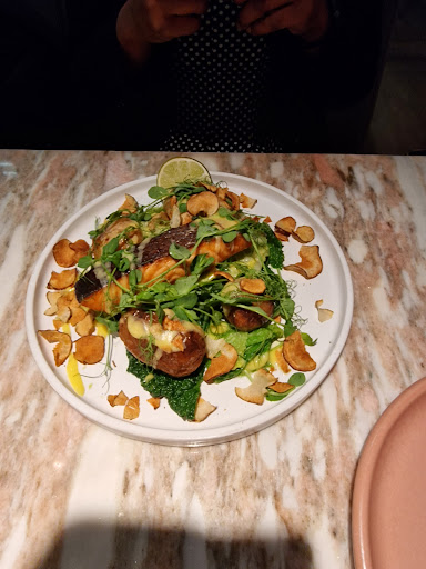I pre-booked for a weekday work lunch. We arrived on time for 1 .45pm to 100 Bishopsgate, where a hostess who could not possibly look more bored or uninterested told us to go outside and round the back to our table. I had to ask her twice to repeat again as no context was given as to why we would need to leave the place. Eventually she bothered to explain that the place has âanother halfâ at the other side of the building. Would have been good to know in advance. We went round the back where no hostess was there. So i waved for help, told them again why we are there (by then it was the 5th time i had to say we had a booking). Then we were showed a corner table. And then ignored for about 10mins without anybody asking if we wanted to order. After 10mins the lets call her waitress came over and ask âwhat do you want to orderâ. Given it was our first time, nobody explained the menu talked to us about options or gave us a chance to ask questions. So i said we wanted to order drinks first. So she asked again âwhat do you wantâ. I told her since we havent seen the drinks menu we dont know yet. Then she reached across the whole table to show me a drink menu that was in front of the only empty seat at our table. So ordered the first things we saw on it with no help or guidance. We also ordered starters again with no help or guidance. Then she left and 20 mins later somebody else showed up with our orders. The food was mediocre at best. But as we were finishing our starters we wanted to order mains to save time. So I waved about 10 times at all the waiting staff, all ignored us. Then our dedicated waitress went to the next table and see me waving at her she said and i quote âplease wait i am with a customerâ. Had i not been that disappointed and angry by then i could have thought it was funny how much this poor waste of space of a person did not speak English nor knew what service was. She eventually came over and repeated âsorry i was with a customerâ. So i explained to her that we, I, and everyone else sitting at the tables are customers. Dont think she understood the sarcasm or the words. We eventually ordered again with no help or guidance. The last straw was that she left the starter plates on the table until the mains were brought. And when she eventually realised that we finished our drinks she asked âdo you want another one?â. Infuriating! Somebody train staff on how to service! In city where there are so many choices the service would have saved the place as the food was also nothing write home about. We will definitely not be back. I did not even bother taking more photos. An...