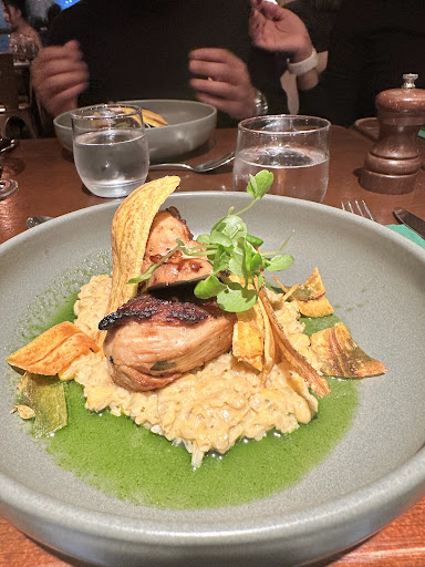 The three-course meal offered a variety of choices, and we sampled several dishes: • Starters: I had the chicken starter, which was flavorful and well-seasoned. It came with a pickled mayo dip that added a tangy kick to the dish. My wife ordered the tuna tartare, which was the highlight of the starters. The tuna was fresh, with vibrant lime and avocado flavors that balanced beautifully. • Mains: For the main course, I had the mojito chicken, while my wife opted for the cod curry. • The mojito chicken was a generously portioned dish, likely grilled or roasted, served on a bed of corn purée blended with other elements that added a subtle sweetness. While the chicken was well-cooked, it was slightly on the dry side and could have benefited from a touch more seasoning. • The cod curry featured a large piece of well-cooked fish and a flavorful curry base. However, the dish lacked balance and could have used a fresh element to lighten the overall flavor profile. • Desserts: For dessert, we tried the chocolate tart and the baked cheesecake. • The baked cheesecake was a standout—light, airy, and perfectly creamy. • The chocolate tart, while paired with a delicious sesame twirl and cream, felt a bit dense and overcooked. It could have been improved with a softer, more decadent texture.