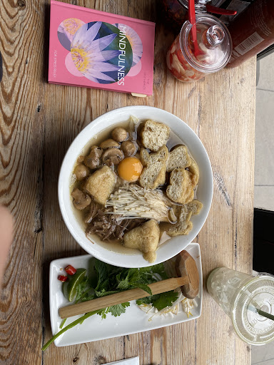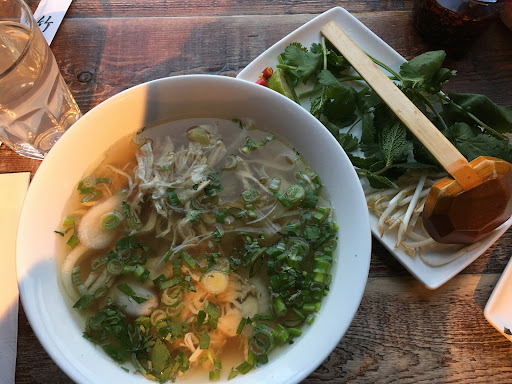 The food was the big letdown for me. I had the Pho Ga (chicken pho) which was very bland and it came with the wide rice noodles which wasnât made clear. I prefer the thin rice noodles because theyâre easier to eat. The broth was pretty tasteless so I had to keep adding sauces â including the Hoisin sauce which isnât on the table but theyâll gladly bring it out. The ingredients were fresh and the chicken was obviously cooked there with thick pieces which was nice but unfortunately it was dry, rubbery and difficult to eat. I would chew and chew but couldnât swallow it because it wouldnât break up. Had to spit it out. The huge wooden ladle was fun to use. The chopsticks were wooden which I actively prefer because they grasp better.