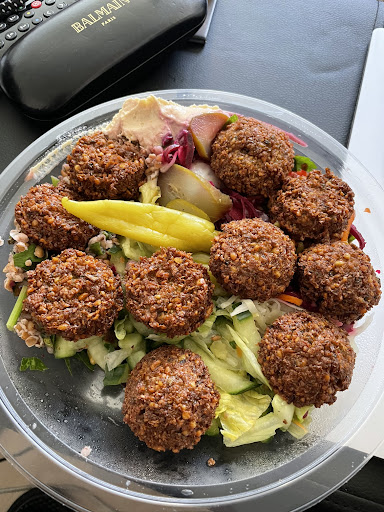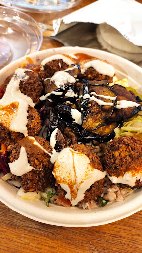 Going through the reviews everyone seems to enjoy their food hence probably it is my taste what the problem is. In general I like falafel but this one just did not meet with my expectations. Also the cheering vibe during rush hour and loud music were not my thing at all. The lady giving free samples of falafel in the queue was a nice touch though. From time to time one of the cashier shook a bell and everyone cheered sorry but it was too much. Falafel was dry and not much of taste. Big portion but it just did not get me. It will not be my favourite place for sure. Try it and decide. Also you tell them what you would like to have and what else you want as an extra added to your pita or falafel box but you pay at somewhere else not there where you get the food from. Hence you have to explain them what you are having or they try to figure out and there may be mistakes like I was charged for extra Aubergine that was originally...