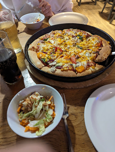Read moreAgainst my better judgement we decided to visit Pizza Hut after a viewing of the 1990 Teenage Mutant Ninja Turtles film, as pizza seemed appropriate and we hoped to double up on some early 90s nostalgia - back to a time when Pizza Hut dominated the UK pizza scene with it's thick oily bases before better alternatives arrived. We had to queue for a short while surprisingly, it was early in the evening so I assume people were looking for a quick and easy pre-theatre meal. We were unfortunately sat in the gloomy windowless downstairs area, on a tiny table stuck between a till point and a wall adorned with ancient peeling artwork of pizza-themed super heroes. The table was so wobbly we had to put a total of three napkins under to steady it. Waiting staff were fast but impersonal, with ordering done via a QR code and online menu as though we were back in pandemic times. Everything felt geared to turning over tables as quickly as possible. Once we'd ordered the waiter brought glasses for our self-serve drinks and they were absolutely disgusting - covered in fingerprints, smears and lip marks, as though they hadn't been washed in days. I asked for cleaner glasses but the ones we received weren't much better. The infamous salad bar was just as you remember it, tastes have changed but it has not. The produce was of an extremely low quality - browning lettuce, limp cucumber and the blandest tomatoes I've ever tasted - I've had tap water with more flavour. The pizza itself was just as I remembered for better or worse - thick, doughy, oily base and a reasonable amount of cheese and toppings. I found the prices startling, around £30 for a large pizza and £13 for a small, medium no longer an option. The atmosphere was abysmal - the couple behind us were having an extremely unpleasant argument during which he told her to 'sit down or I'll drag you down', not the restaurant's fault - unless the flaccid salad had put them in such a foul mood that they had resorted to verbally abusing each other. It's hard to find much to recommend about the the Hut - the pizza was edible but you'd be better off at one of the many other pizza restaurants in the area. Unfortunately as the queue showed there will never be a shortage of tourists and theatre-goers who don't know any better to keep the place churning out overpriced, below average,...