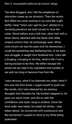 Greated by the joyous smile of the hostess and guided towards a table. The question “just two?” had never sounded so heavenly. So we sat, legs outstretched, facing the ovens that roared and blasted. My brother turned and asked “can you feel Him, His warmth”, and I replied “praise, I can, but do not demean the lord with masculine pronouns”. He nodded and I kissed his with my perched lips.