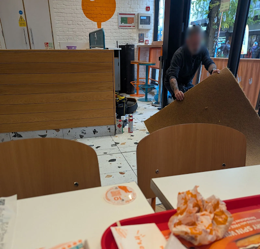 What’s frustrating is that this kind of work could easily have been done earlier in the morning before opening or at least during a quieter time, not during lunchtime when customers are dining. It was also awkward for others coming in and out, as the maintenance worker was blocking part of the entrance.