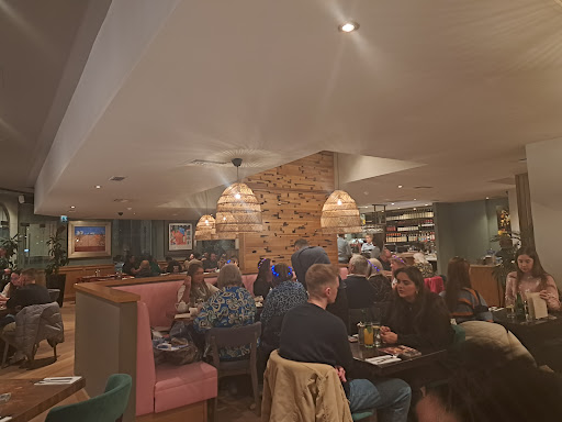 We were seated at a table that was so close to the tables next to it that ours had to be moved against one side to let us squeeze between ours and the other side to sit. This isn't a high-demand one-of-a kind restaurant, but part of a chain with over 180 locations through the UK. We ordered drinks, salads and our main course. The main course arrived first followed my our salads and then our alcoholic beverage drinks all within a minute, essentially at the same time but the server couldn't serve more than two at a time. I ordered "Traditional Lasagne," and the other party ordered a chicken breast withmushrooms. In the delivery methodology and the food taste as well, my being from the US could have affected my review as I may have perceived deficiencies which are the result of differences in dining customs. I would have expected our alcoholic drinks to arrive first, followed by the salad and then the main course. As previously stated, they all arrived at the same time. Regarding the food quality, there were several concerns: my mixed salad had several pieces of greens that had brown places which should have been removed. The "traditional lasagne" tasted like moussaka, not lasagne. Though there was no Aubergine (eggplant) mixed with the ground meat, the overwhelming allspice flavor without oregano, garlic or onion left me to think of moussaka instead of lasagne. Additionally, it was not a nice layered mix of meat, pasta, ricotta, sauce, (repeat) but a soupy mixture with a toping like cheese sauce rather than a stringy mozzarella. As I said, perhaps what I expected should not have been expected. The chicken in the mushroom dish had been beaten to a thin piece and then overcooked so it no longer resembled real chicken breast, but the stuff McNuggets are made of. The mushroom sauce was watery but there were an abundance of mushrooms so that, if you got a mushroom in each taste, it had a mushroom flavor. What we ordered dessert, we selected the Raspberry Sorbet. My dining partner received theirs and in about five minutes, when the server returned and noticed I had not received mind, she returned to the bar (yes, sorbet is a bar item) and requested an additional one. It was served in a parfait cup that was hot to the touch, which allowed me to easily catch up since it was melting as fast as I could eat. Hence, the...