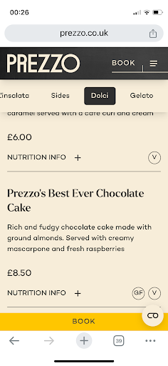 Read moreWe didn't reserve a table (for 3) so we were shown to the table that was actually outside of the boundary of the resturant. We weren't in an argumentative mood, so we accepted the table and pulled it in closer, so we felt like we were in the resturant and not dumped outside the gold line boundry making on the ground. The staff were present , waitress was slighter friendly than the inniskilling waiter/manager, she had limited spoken English but we communicated our menu choice well. We could not however use our Prezzo voucher code becuse 1 if us ordered from main menu and two from Xmas menu, we were disappointed with that. The food was hot, the starters were the best, tasted better than the mains, which lacked in flavour, white bland chicken breast, dry and hard, presentation on the plate quite basic and sloppy. The desserts were very good, chocolate bomb, lovely rich chocolate flavour and the best part of the meal. The facilities, clean and tidy and general areas, clean and no loud music. Not sure if we would go again, but we...
