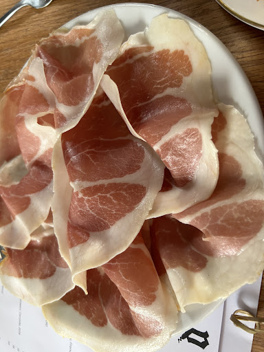 Interior Atmosphere Rustic, you could be in Italy but it’s old school and basic , working area as you come in for the butchers. The next room is the kitchen with table seating. Rustic wooden floors, a marble tables oddly placed in the middle of the dining room , shelve seating to one side and a number of tables. Menu on the board as well as paper form. Exterior seating too but on road very close to cars driving downhill so not the best ambience. Seating is uncomfortable and cramped. Seating close to the open kitchen had an intermittent smell of food items burning.