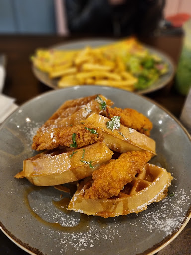 Read moreThe interior is very minimal, abstract and colourful & the cafe is very spacious. It emulates cosy and comfy vibes and it's a perfect spot to have some great food with friends, family, colleagues etc. Their food was delicious😍. Pictured above is the chicken & waffle which was absolutely scrumptious🤤. The chicken was crispy & cooked to perfection as well as the Waffles & the maple syrup always adds a nice touch to a dish like this. My only critique is that there weren't enough chicken to match the Waffles. The omelette & chips were flavoursome & tasty. Their smoothies & milkshakes are fantastic esp the oreo milkshake 🥤. It was thick, creamy & rich😍😍👌🏼👌🏼. The lotus & banana pancakes were divine 🤤 & we devoured it in minutes🥞. Overall, their food was delightful & we left very happy & satisfied 🤤😋😁. The service was servicing 😅 & they have other branches around London including Forest Lane & Shadwell.