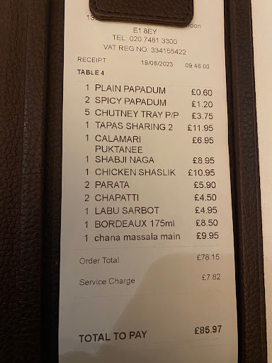 Read moreAwful could not begin to cover our unfortunate run in with this restaurant. When we arrived we first had to wait 25 minutes for a table which we understood and waited patiently at the bar. A bar man eventually came to serve us and straight away went to serve my step dad and ignored me and my mother until my step dad told the barman to serve us first. We were eventually shown to our table and had to wait another 20 mins for someone to take an order. We asked for 3 plain and 3 spicy poppadoms and ordered our mains and our drinks. After another wait, 3 plain poppadoms were bought out. We asked 3 times for the other poppadoms and on the 3rd time of asking, 3 folded over sorry looking poppadoms where bought out with still no signs of our drinks. Eventually the drinks were bought over however they had got the order wrong, we corrected the order and waited for the amended order which when it arrived was wrong again. We then decided that we did not want to eat at this restaurant as it was so bad and the staff were rude. When we tried to leave they tried to stop us with one waiter trying to block the door, he moved promptly when my step dad walked towards the door as he is a large man. All in all I would advise anyone to stay away from this establishment, never have I had such an awful and enraging...