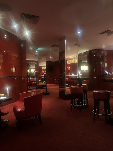 Upscale bar with scarlet walls, floors and leather tub chairs, for creative cocktails and park view.