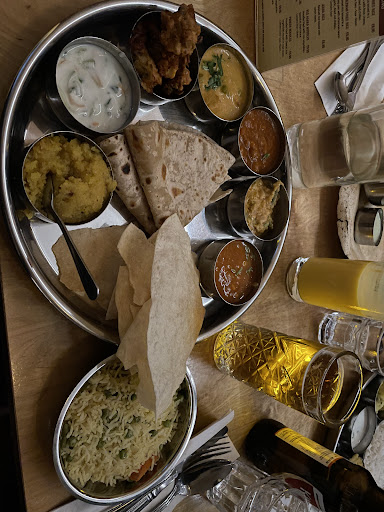 Our group had the South Indian Thali, Rajdhani Thali (North Indian) and another had a paneer dosa. The paneer dosa was delicious, North Indian Thali came with 2 rotis (thinly rolled and well made but large size), a small serving of pulav rice, 3-4 curries (tiny portions), papad and sweet dish (halwa) and a raita. The South Indian thali came with 2 (large) puris instead of rotis, plain rice, sambar and couple of South Indian curries. Both thalis were delicious and quantity was ample (too much for us as we aren’t big eaters). Given the tiny quantities of curries we asked for an extra helping of a couple we liked but they seemed quite grumpy at being asked for that but reluctantly obliged.
