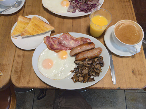 There were seats available, we were given a menu, and then our order was taken. We both wanted full English breakfasts, without beans, and were given the option to substitute for something else. I took an extra sausage.
