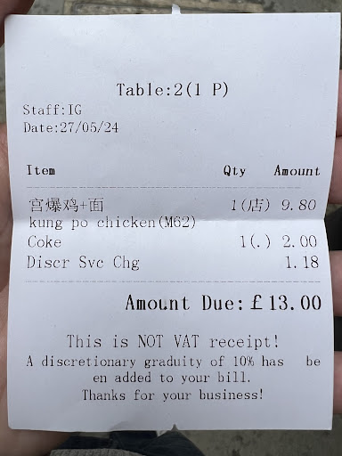 We went to this restaurant thrice, the food was okay as we are tourists we didn’t have much options to explore at that point of time but as the food was good we went there and near our hotel. First day, the staff didn’t behave badly she was nice I couldn’t remember her name but she was really nice. As, the service charge was optional we asked to remove it and it happen the next day also the same thing happen they added a service charge and when we asked to remove it , they did. The final day when we went there we have ordered the same thing, chicken wings but the food was not upto the mark, they didn’t provide the salad which was there the previous day we ordered the food. When asking them they said, it was just for decoration, fine… when my husband asked for soya sauce they said it was chargeable, but strange isn’t it? They charged me 1 pound for soya sauce i am pretty sure it had to free in any Chinese restaurant as i have had many times to restaurants. Well, even that day some other lady was there , her behaviour was miserable she behaved so badly with my husband, she told that last two days she forgot to add the soya sauce and chilli oil to the bill and today if we take we have to pay for it . Okay, that was fine too but she then added saying last two days you didn’t pay us the service charge so either you pay for that or you pay for the soya sauce… her demand was to take service charge from us as we didn’t give her she behaved badly with a bad tone and her way of talking to a customer was not at all acceptable. As we felt insulted we didn’t order further that day and had to leave. She was rude, this is highly inappropriate behaviour towards a tourist and that too when we are going to the same place. Infact, I will attach the same dish but the difference you can get through… well, all what i wanted to say is that you cannot forcefully charge someone to give service charge if they are not willing to pay. This kind of behaviour in a resturant is highly unprofessional. I will never go & will not...