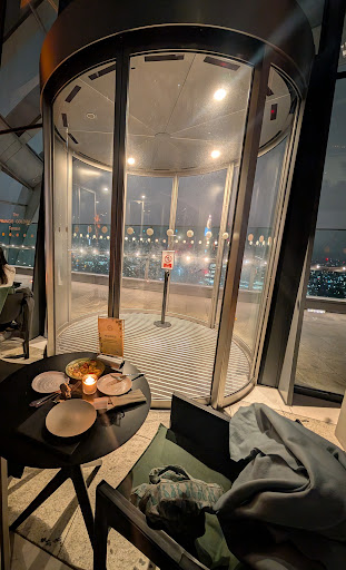 I booked a table on the day we were visiting, and there wasn't any reference on the website that there are multiple types of seating available. When we got there, we got seated at a table which shouldn't exist - next to the revolving exit door, a 'no entry' sign as a view, chairs facing towards glaring lights which are out of sync with the rest of the lighting at the venue. We asked if we could be moved anywhere else, as there were empty seats, and got told they were paid seats and were booked, which is completely fine, but it's important to note that we couldn't have known that different types of seats existed, so I didn't appreciate that the staff made it seem like we were being unreasonable from the start.