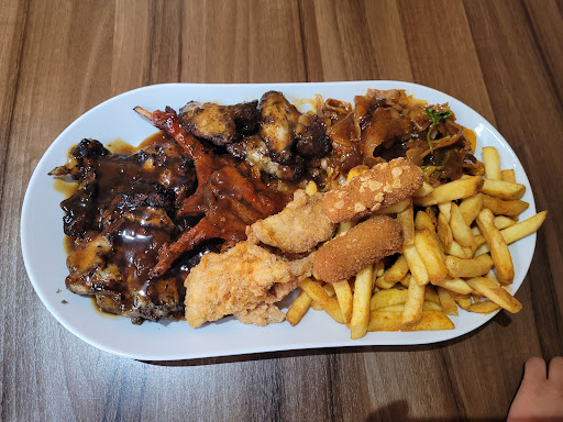 Grill box comes with a variety of things including jerk doner (was ok), 2 lamb chops (although I got 1 and 1 literally a bone) but flavour was ok, chicken strips/tenders (very moist and tasted ok), half chicken was really really bad (extremely salty), 2 jerk wings again extremely salty, jerk sauce itself was very salty, chips was ok, jalapeño bombers from frozen pack.