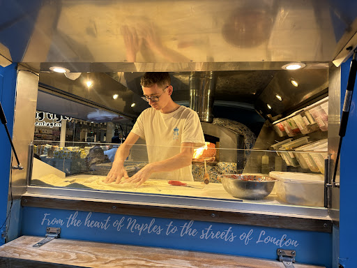 Friendly staff, good service despite how busy they are, great venue in Spitalfields. All that stuff is nice but if you want to focus on just the pizza then you won't be disappointed. The toppings taste high quality and fresh, especially the cheese. The crust was perfect. Just go there and enjoy a great pizza that they somehow produce out of a van. Well done to the guys making it, you can see them working really hard in there.