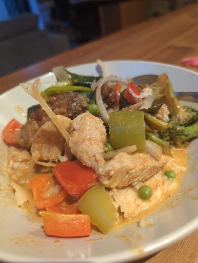 The Thai salad with dressing tasted off to be honest and the satay chicken was also dry, to the point of being inedible. The peanut sauce you pay and extra 35p for in order to have it with the supposedly satay chicken is a tiny portion, not even enough to cover 2 of the 4 chicken skewers. The green curry was alright but the chicken was tough.