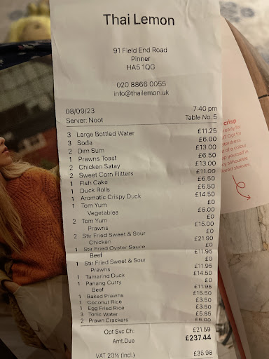Me and my family used to love Thai Lemon. It is one of our favourite local restaurants. We would visit at least 1-2 x a month. The previous owners were amazing and always offered a great service with their food and hospitality. The owners have changed and we visited once a few months back and did not meet our expectations. We decided to give them another chance today and can safely and sadly say will NEVER be visiting Thai Lemon again. Unfortunately the food is just not worth eating out. Maybe we are just so used to the amazing food we used to have by the previous owners but this just does not compare all. Prices have also increased which ok is understandable but they have also added a service charge to their bills. £240 bill and the duck pancakes were mouldy (wish I had taken a photo, large area of mould). When pointed out to the waitress she did not even apologise and simply said ‘I will get you a new one’. We were put off and didn't continue eating it. The duck was VERY dry and clearly old. Spring rolls full of oil inside. Drinks were not even cold from the fridge. Offered at room temperature with no ice in 32 degrees weather? Tom yum appaling, extremely salty and mushrooms very old. We did not finish these. Barely any meat in the sweet n sour chicken and oyster beef. No flavour in any dish whatsoever, thai food is meant to be very flavoursome. Really not worth £240 very disappointing. They didnt even offer to reduce the bill or remove service charge after the mouldy pancakes. Very unprofessional and food is not up to restaurant standard. Can tell they dont have a...