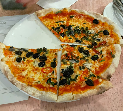 A dad tucking into what looked like a really nice pizza with his two young kids, a couple of 30 something mums, one with a pram snuggling her young babe chatting away to her friend, a cheeky bottle of something white and cold between them.