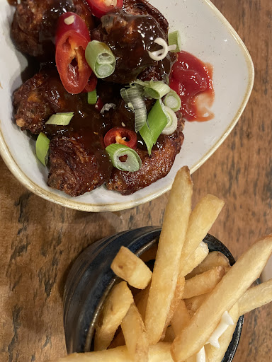 The food and drink setup hit that sweet spot between variety and comfort. Opting for Korean barbecue wings and fries was a smart move—there’s something satisfying about that mix of sticky, tangy sauce with a kick, clinging to crispy wings, paired with the simple, salty crunch of fries. Not gourmet, but “fine and acceptable” in the best way: reliable fuel for a good time. The bar’s lineup of craft beers and draughts probably gave you plenty to choose from—maybe a hoppy IPA or a smooth lager to wash down the spice? It is the perfect post-work spot; it’s got that laid-back appeal where you can loosen the tie (literal or metaphorical) and just enjoy. The efficient, friendly service sealed the deal—nobody wants to be waving their hand for ages when the next...